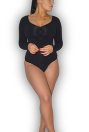Denna sömlösa bodysuit med lång ärm och v-ringning är designad för att forma, stödja och ge en skulpterad silhuett – utan att kompromissa med komfort. Den täta vävningen i midjepartiet ger en omslutande känsla och kraftfull kompression, samtidigt som det elastiska 360°-materialet följer kroppens rörelser.